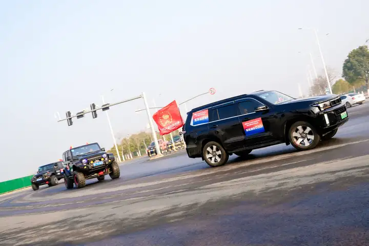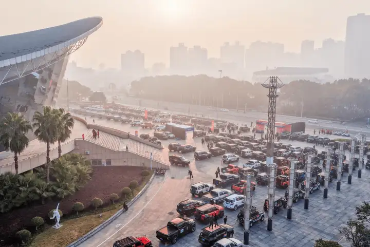 随着发车指令响起,百台“越野猛兽”们如钢铁洪流般浩荡启程。车队穿越七里河路,驶过汉江路与中原路的都市繁华,经襄江大道一览新城气象,再通过壮观的鱼梁洲隧道横跨汉江。最终,车队沿南山路、蔡洲路、苏岭路蜿蜒行进,气势如虹地抵达趣味越野体验活动现场。